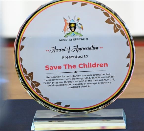 Save the Children Uganda was recognized and appreciated by the Ministry of Health and the Committee of Experts on the National Safe Motherhood Committee for its outstanding contribution to strengthening the policy environment, planning, and monitoring and evaluation of Adolescent Health and School Health programmes. This recognition further highlighted our role in supporting the implementation of the National Adolescent Health Costed Implementation Plan (ADH CIP) and in building the coordination capacity of districts heavily burdened by teenage pregnancy.